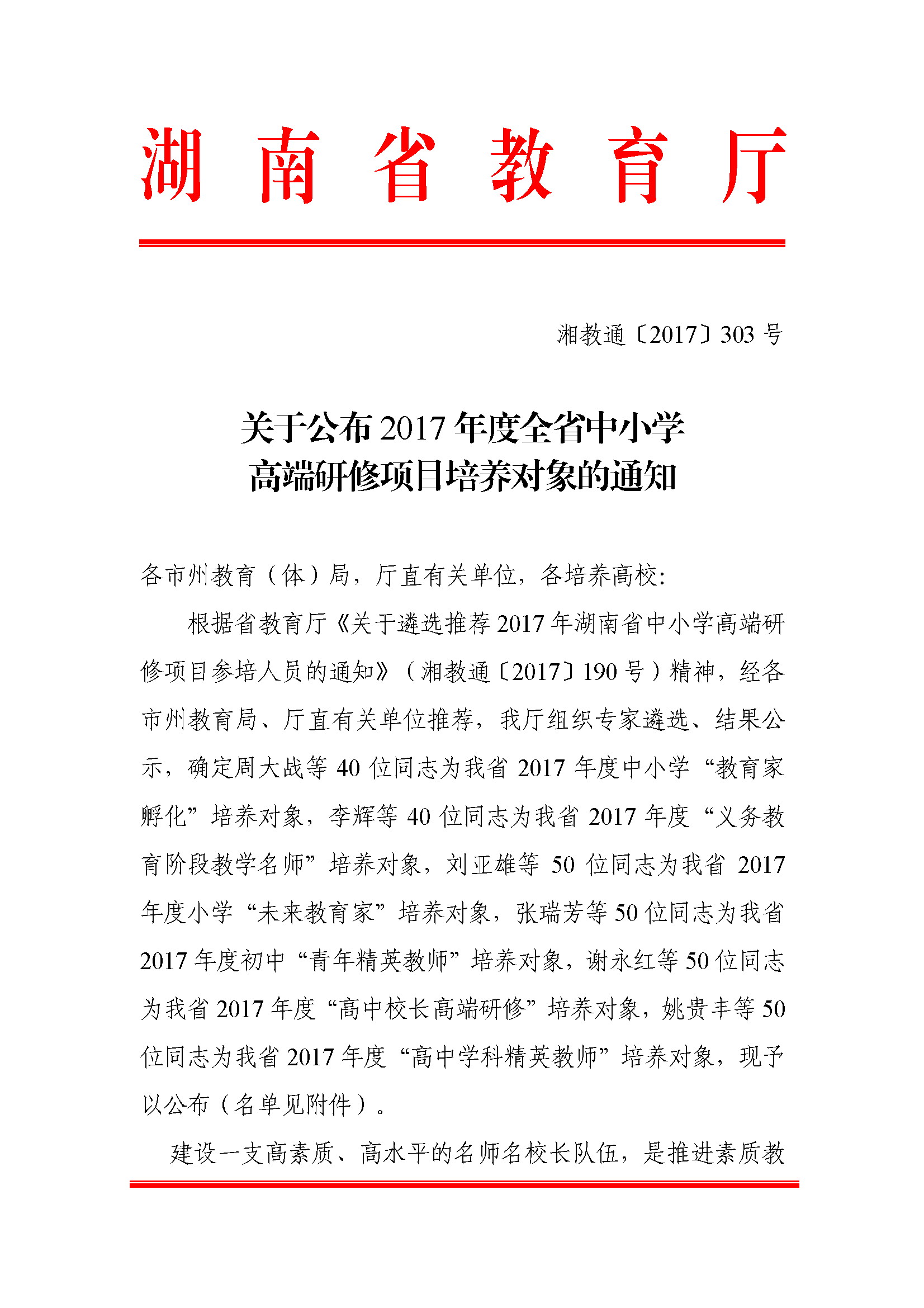 湘教通〔2017〕303号 关于公布2017年度全省中小学高端研修项目培养对象的通知
