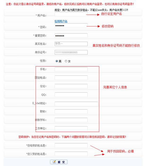 注:用户首次登录用户名为身份证号码,密码为888888,进入完善个人信息页面后可自行设定用户名。