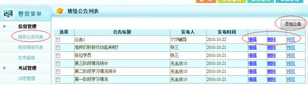 点击“班级公告列表”,可以在此发布及管理班级公告(如图18),点击“添加公告”按钮,进入编辑公告页面,输入公告的标题与内容,再点击“确认”即可发布成功。